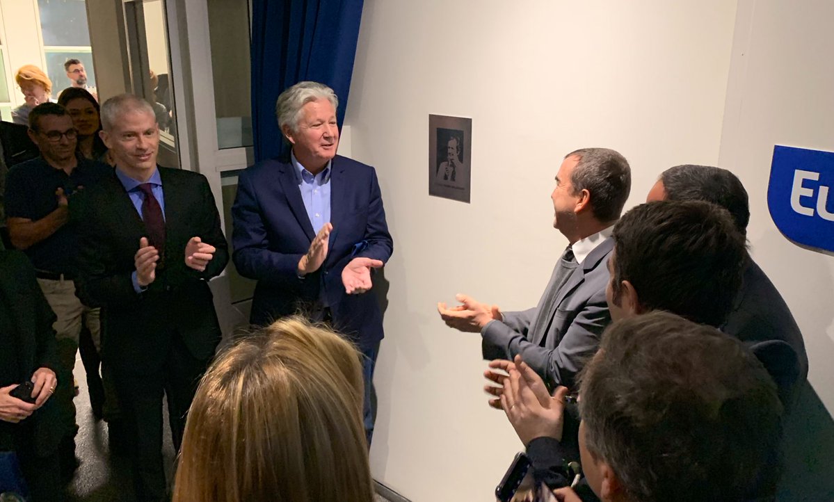 Pierre Dhostel et Arnaud Lagardère ont dévoilé cette plaque à l'entrée du studio "Pierre Bellemare". Photo service presse Europe 1