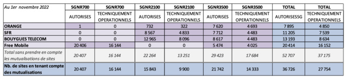 En métropole, le nombre total d'autorisations pour les sites 3G s'établit à 58 548 au 1er novembre 2022. En métropole, le nombre total d'autorisations pour les sites 2G s'établit à 41 615 au 1er novembre 2022. Par ailleurs, 58 745 sites 4G sont autorisées en métropole dont 53 958 sont déclarés en service selon l'Observatoire du déploiement des réseaux mobiles.
