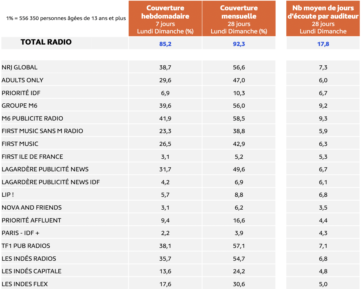 Plus de 9 personnes sur 10 (92.3 %) écoutent la radio sur un mois, soit 51.3 millions de personnes âgées de 13 ans et plus. En moyenne, les auditeurs écoutent la radio 17.8 jours par mois sur 28, quels que soient la durée de cette écoute et le support utilisé, en direct ou en replay. 81.2% des personnes écoutent la radio à domicile et 84,8% en dehors du domicile.