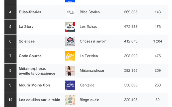 En avril, et pour son nouveau classement mensuel, l'Alliance pour les Chiffres de la Presse et des Médias accueille 3 nouveaux podcasts : "Sur le Fil" de l'AFP Audio, "Le Système" de Slate et "Sexcast" de L'Indépendant. Ce mois-ci, le réseau "Choses à savoir" dépasse la barre des 5 millions d'écoutes.