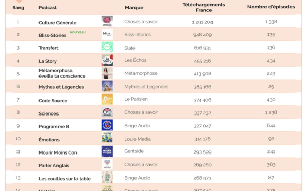 La semaine dernière, Médiamétrie a publié les nouveaux résultats issus de sa mesure eStat Podcast. Cet outil comptabilise l'ensemble des podcsats écoutées en streaming ou téléchargés, replays ou natifs. Pour la première fois, le classement par marque a été enrichi du classement par émission...