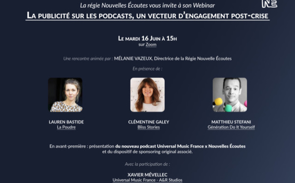 La régie publicitaire du studio Nouvelles Écoutes organise un webinar, ce mardi 16 juin à 15h sur Zoom. Cette rencontre numérique déclinera le thème de "La publicité sur les podcasts, vecteur d'engagement post-crise" autour de podcasteuses et de podcasteurs.