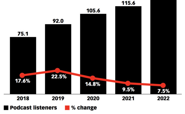 L'audience des podcasts américains a considérablement augmenté en 2019, car des investissements importants des principaux services de streaming audio ont rendu le contenu plus accessible. eMarketer comptabilisait 92 millions d'auditeurs de podcasts par mois en 2019. Un chiffre en hausse de plus de 15 millions par rapport à son estimation précédente de 76,4 millions.