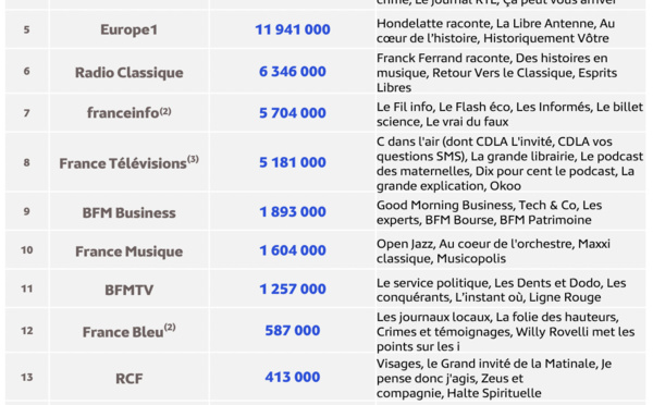 Au mois de septembre, selon eStat Podcast de Médiamétrie, plus de 172 millions de podcasts français ont été écoutés ou téléchargés dans le monde. En France, 134 millions de podcasts français ont été écoutés ou téléchargés au cours de ce même mois.
