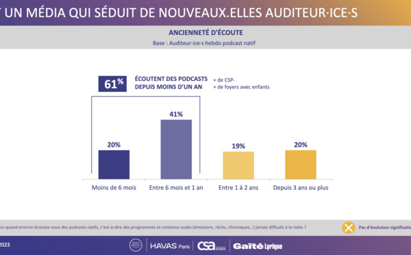 À l'occasion de la 6e édition du Paris Podcast Festival 2023, qui s'est tenue vendredi et samedi à la Gaité Lyrique, l'institut CSA a dévoile son 5e baromètre sur le podcast natif. Et ces résultats du baromètre CSA/ Havas Paris sont sans appel : la notoriété du podcast natif progresse, et 40% des personnes interrogées disent savoir ce qu’est un podcast natif, contre 31% en 2022.