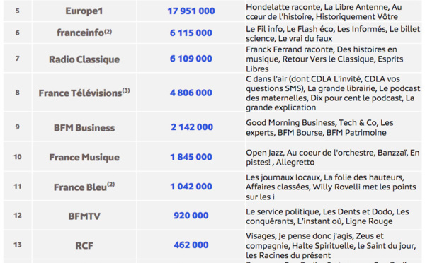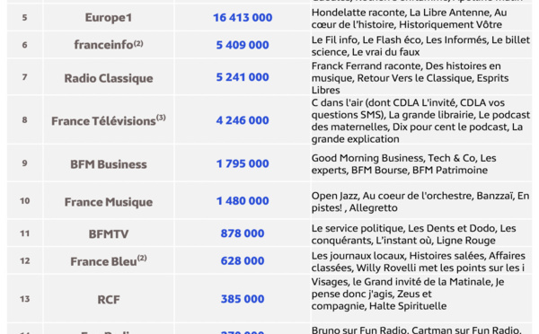 Europe 1 et ses productions confirment leur attractivité en matière de grands récits, d’histoire, mais aussi d’humour, avec près de 16.5 millions de téléchargements (+ 17% en un an). Trois programmes de la station se placent ce mois-ci dans le Top 30 du classement eStat Podcast de Médiamétrie : "Hondelatte Raconte", "Historiquement Vôtre" et "Au cœur de l’Histoire".