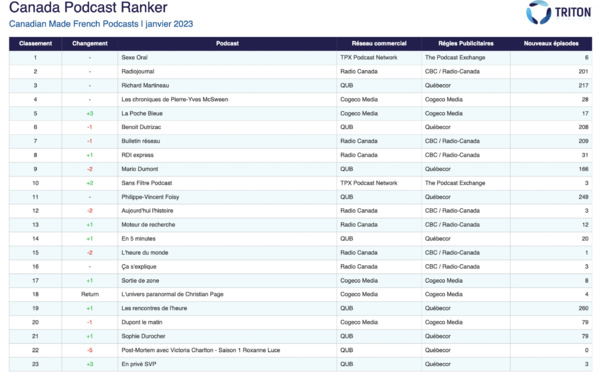 Le rapport sur les réseaux canadiens répertorie les meilleurs réseaux des ventes au Canada, tels que mesurés par Podcast Metrics. Le service de mesure Podcast Metrics de Triton Digital est certifié par l'IAB Tech Lab comme étant conforme à la version 2.1 des directives techniques de l'IAB Podcast Measurement.