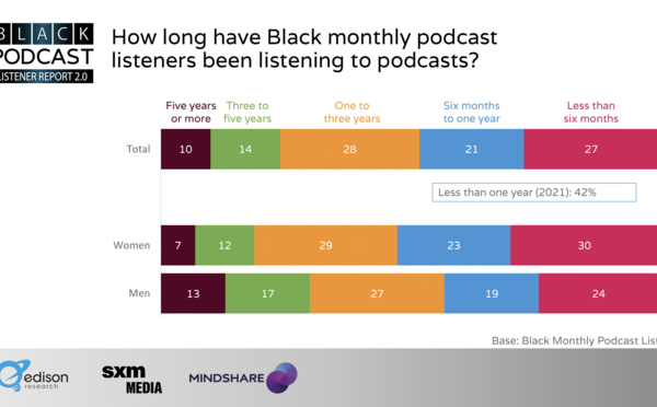 Selon l'étude "Black Podcast Listener Report 2.0" d'Edison Research avec SXM Media et Mindshare USA , 43% de la population afro-américaine de 18 ans et plus aux États-Unis a écouté un podcast au cours du mois dernier. Ce pourcentage est supérieur au nombre de la population globale de 18 ans et plus qui déclare avoir écouté un podcast au cours du mois dernier, 38%.