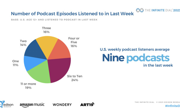 Aux États-Unis, 42% des Américains de 12 ans et plus ont écouté un podcast au cours du mois dernier, un nouveau record absolu et une augmentation par rapport aux 38% enregistrés en 2022. La majorité des Américains (53%) ont écouté un podcast au cours du mois dernier et 3% ont écouté un podcast au cours de la semaine écoulée. Des résultats là aussi en hausse significative par rapport aux 26% générés en 2022...