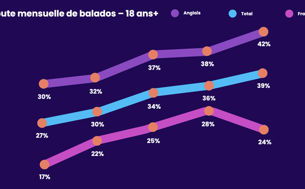 La croissance des podcasts canadiens s'accélère en 2025, notamment grâce à l'augmentation de l'audience en langue anglaise, à la croissance des genres d'information et au maintien de la stabilité des habitudes d'écoute sur les différentes plates-formes. Chaque mois, l'écoute de podcasts au Canada atteint les 39% parmi les adultes canadiens, tandis que YouTube dépasse Spotify en termes de part de plateforme...