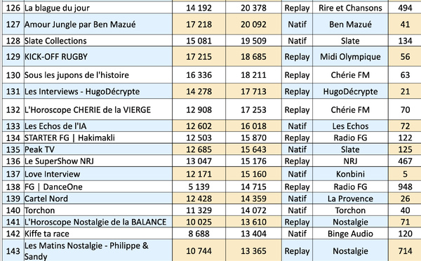 Au mois de juin, plus de 172 millions de podcasts français ont été écoutés ou téléchargés dans le monde. En France, 137 millions de podcasts français ont été écoutés ou téléchargés au cours de ce même mois. En juin, l'émission "Les Grosses Têtes" sur RTL a été celle qui a été la plus réécoutée devant "L'After Foot" sur RMC.