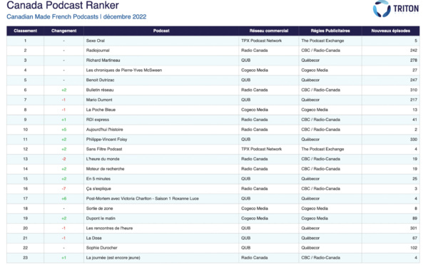 Le rapport sur les réseaux canadiens répertorie les meilleurs réseaux des ventes au Canada, tels que mesurés par Podcast Metrics. Les entités répertoriées sont classées en fonction du nombre moyen de téléchargements hebdomadaires au cours de la période de référence et situés au Canada.