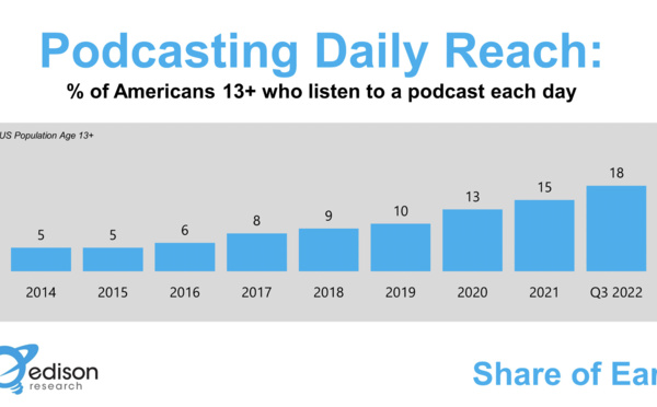En 2014, première année de l'enquête Share of Ear, les podcasts avaient atteint 5% des personnes âgées de 13 ans et plus aux États-Unis. D'après les données les plus récentes, au 3e trimestre 2022, les podcasts atteignent désormais 18% des Américains soit une augmentation de 20% au cours de l'année écoulée...