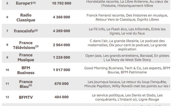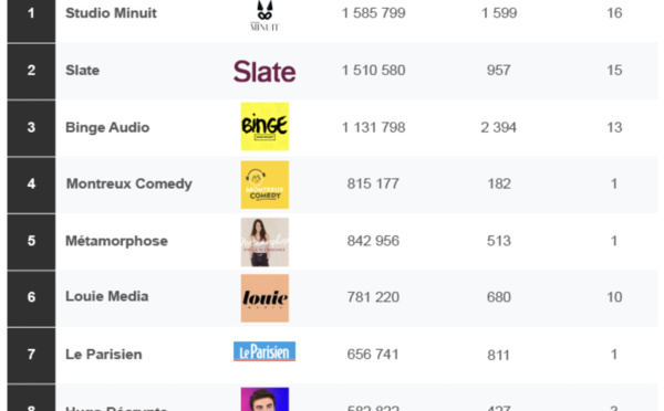 En août, l'ACPM a certifié 13.7 millions de téléchargements de podcasts dont 10.7 millions ont été téléchargés depuis la France. Ce mois-ci, l'ACPM a certifié 6 nouveaux podcasts : "La grande histoire de Pomme d’Api" et "Pomme d’Api", "24 histoires pour Noël" (Bayard), "Arrêt Buffet" et "Tu veux une médaille ?" (Eurosport), "Après la pluie" (Binge Audio) et "Les Interviews de la rédac" (Champagne FM)