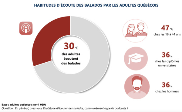 Selon l'enquête NETendances, le tiers (33%) des adultes québécois utilisent les réseaux sociaux comme principale source pour s’informer sur l’actualité. Plus intéressant encore, près du tiers des adultes québécois (30%) ont l’habitude d’écouter des balados (podcast, en anglais).