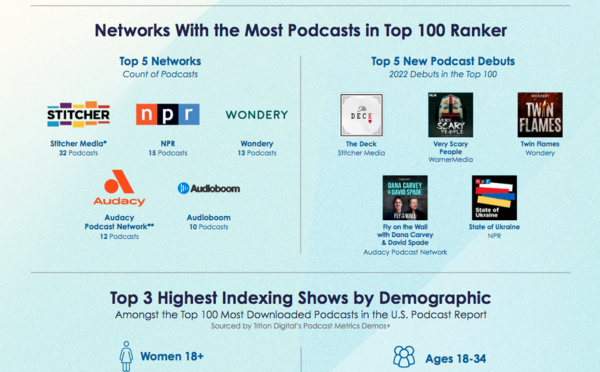 Triton Digital, le fournisseur de technologies et de services pour l'industrie de l'audio numérique et des podcasts, a annoncé la publication de son rapport sur les podcasts américains de mai 2022, qui est désormais disponible sur le site TritonRankers.com, un site web interactif où les professionnels peuvent obtenir un aperçu des tendances de performances mensuelles.