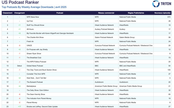 Le classement américain des podcasts pour avril 2025, publié par Triton Digital, confirme la stabilité du podium avec NPR et iHeart, tout en accueillant la BBC dans la mesure. Ce reporting mensuel se base sur des données certifiées par l’IAB et met en lumière les tendances d’écoute et de téléchargement aux États-Unis.