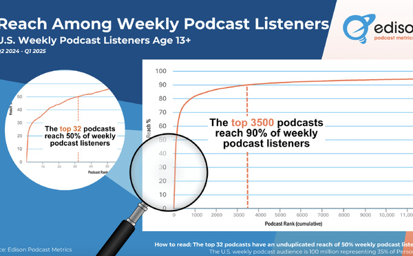 Les derniers résultats d’Edison Podcast Metrics révèlent qu’aux États-Unis, 35% des 12 ans et plus, soit 100 millions de personnes, écoutent un podcast chaque semaine. Les annonceurs radio et audio digital peuvent désormais calculer la portée d’une campagne publicitaire grâce à ces données précises qui montrent qu’avec seulement 32 podcasts, il est possible de toucher la moitié des auditeurs hebdos.