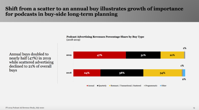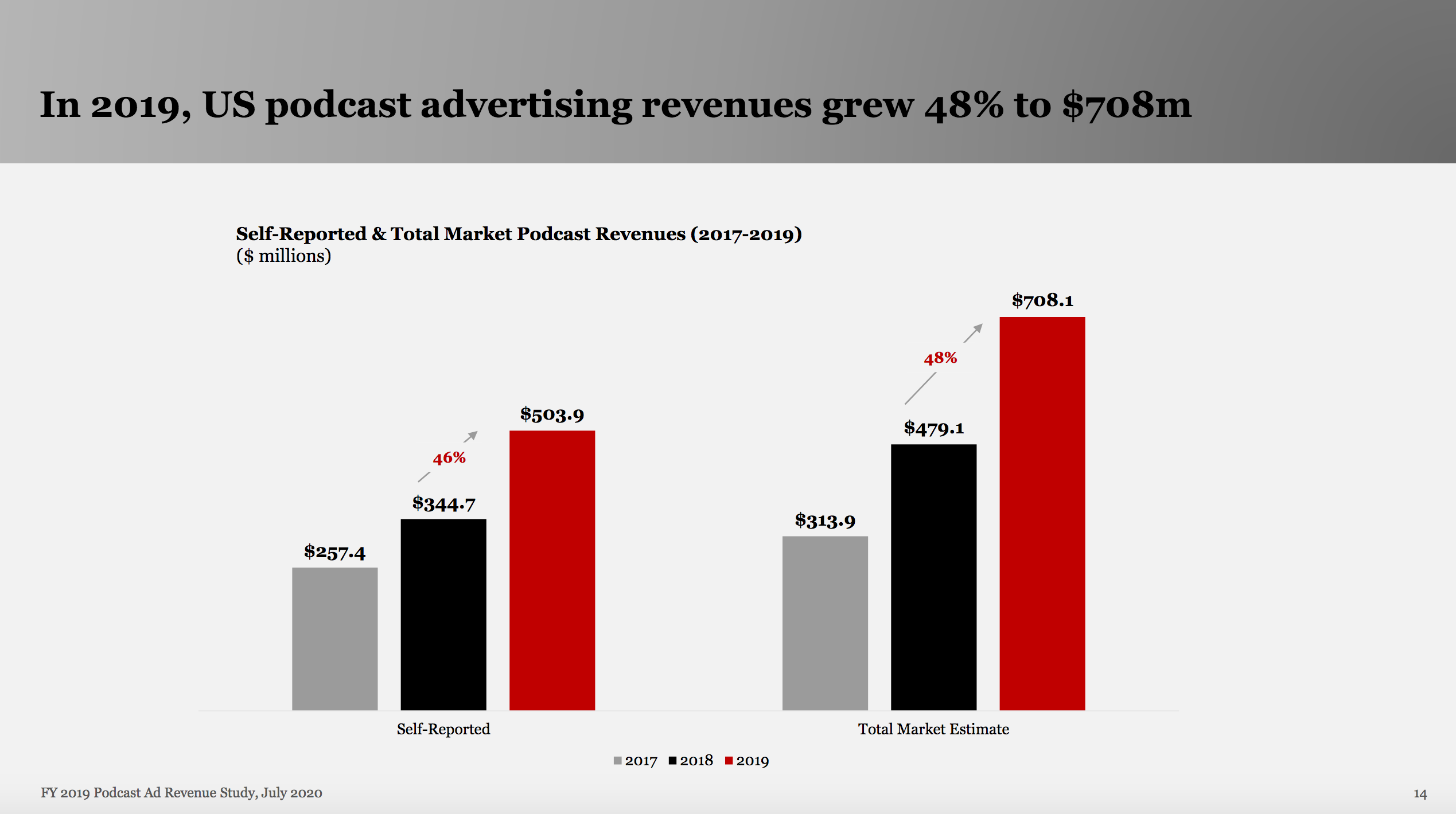En 2019, les revenus publicitaires des podcasts ont augmenté de 48% pour atteindre 708.1 millions de dollars.