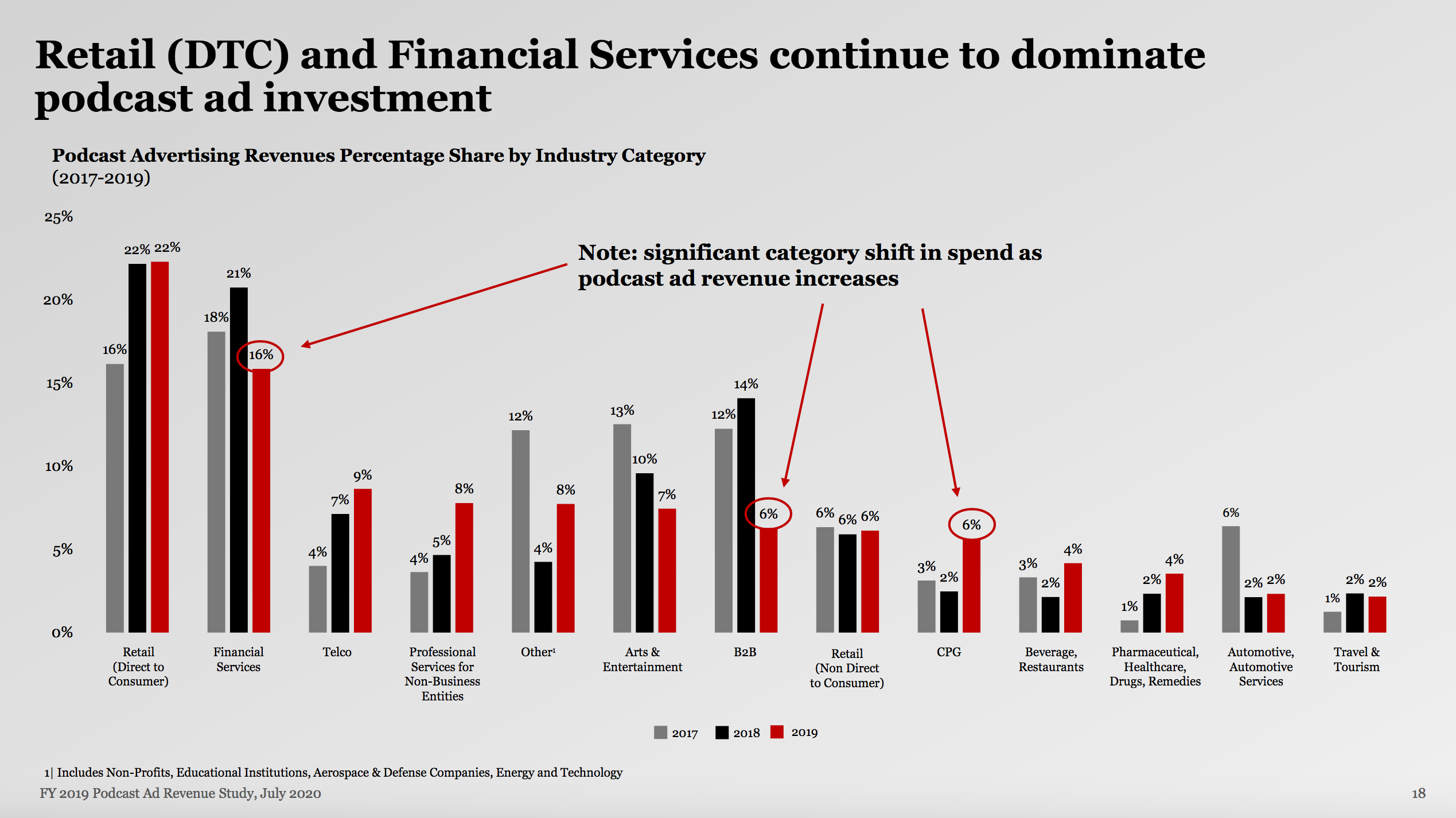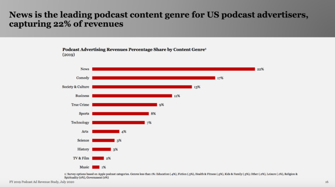 Parmi les points saillants de ce rapport, on retiendra que les marques "Direct To Consumer" (22%) et les services financiers (16%) constituent les meilleurs annonceurs de podcasts (santé et bien-être et "Home & Appliance" sont les plus grandes sous-catégories DTC). Par ailleurs, l'information est le premier genre de contenus pour les annonceurs de podcasts américains, avec 22% des revenus, suivi par la comédie (17%), la société et la culture (13%). La publicité sur les podcasts est considérée plus résistante que celle sur les autres médias notamment durant la crise sanitaire pour plusieurs raisons. D'abord, le format agile et flexible du canal permet un changement rapide du message publicitaire. Ensuite, parce que le genre "News", déjà plébiscité par les annonceurs de podcasts, connaît une plus grande adoption par les consommateurs en 2020.