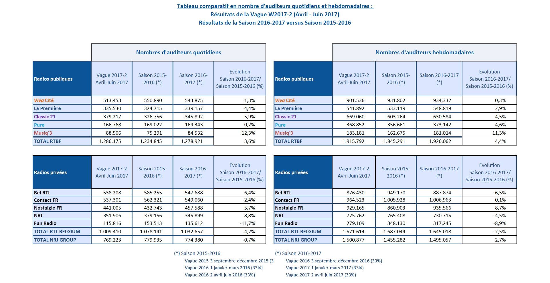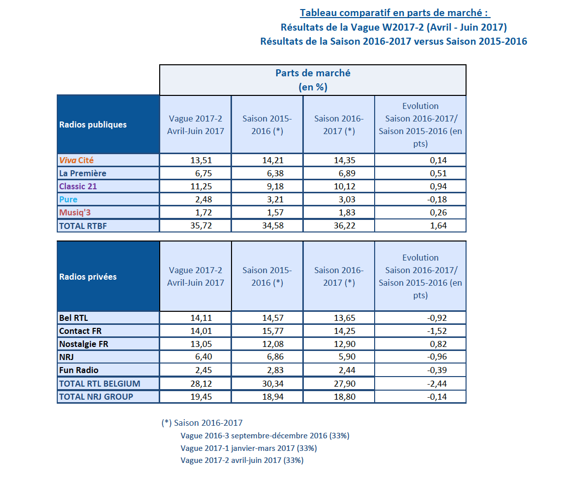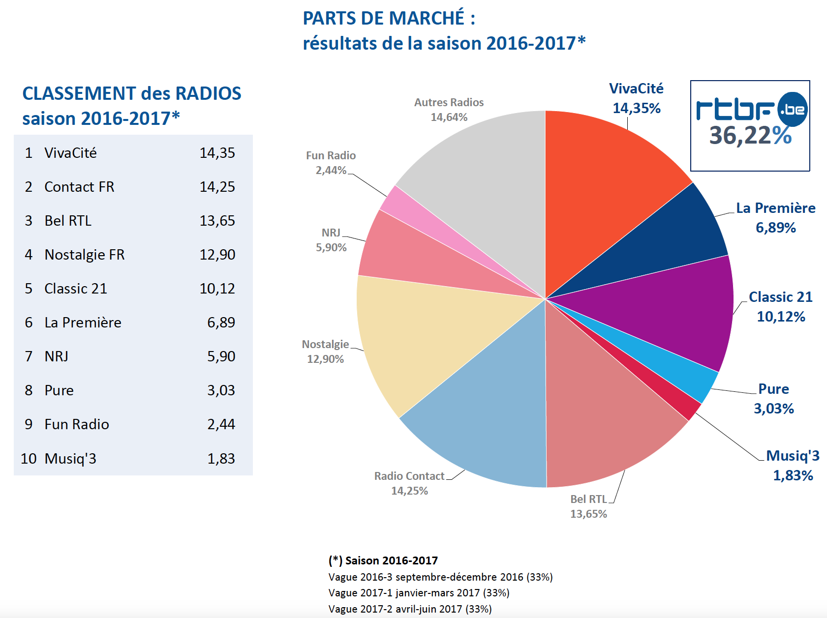 Pour la RTBF, ce bilan de la saison écoulée est particulièrement bon, puisque le service public réalise une nouvelle saison record avec des résultats inégalés sur tous les paramètres : 1 926 062 auditeurs à l’écoute en moyenne chaque semaine de l’une ou l’autre de ses cinq radios - soit plus d’un auditeur sur deux (54,9 %) -, 1 278 921 chaque jour et une part de marché moyenne de 36,2 %. Ces résultats permettent à la RTBF d’être une nouvelle fois confirmée dans sa position de groupe leader dans le paysage belge francophone, quel que soit le paramètre de mesure de l’audience radio, position qu’elle détient maintenant sans discontinuer depuis 2011.