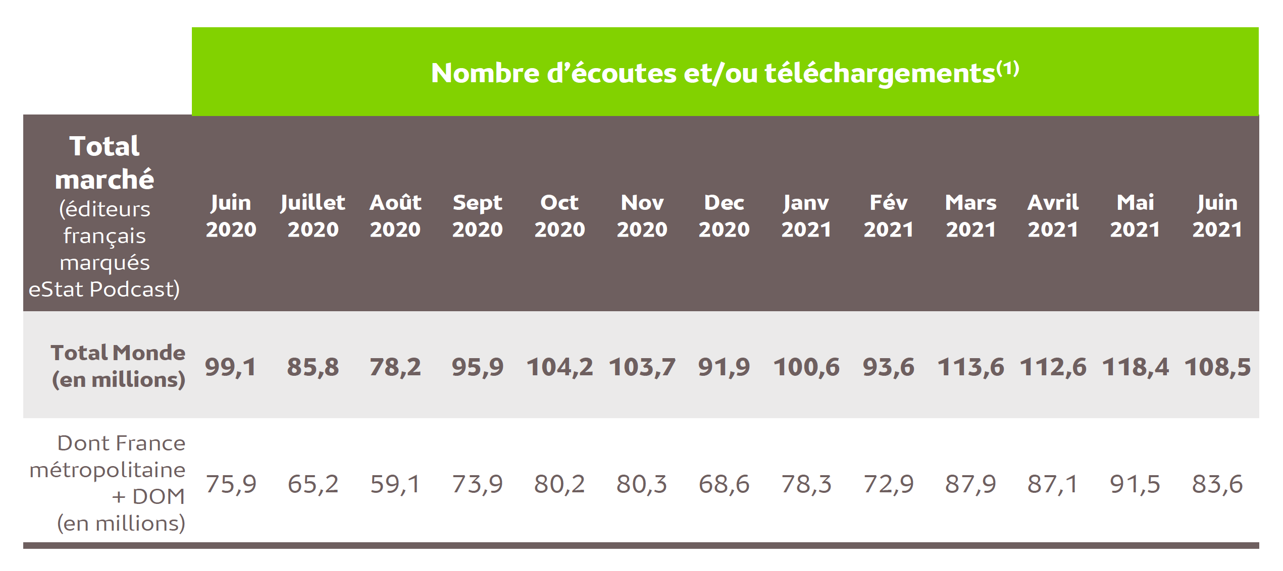 Près de 109 millions de podcasts écoutés et/ou téléchargés en juin dernier. Un chiffre en baisse de 10 millions par rapport au mois dernier. L'arrivée de la période estivale et des grandes vacances ne vont probablement pas aider l'audience digitale à soutenir son ascension : les deux mois d'été n'étant pas, traditionnellement, les meilleures périodes pour générer de l'audience sur le numérique.