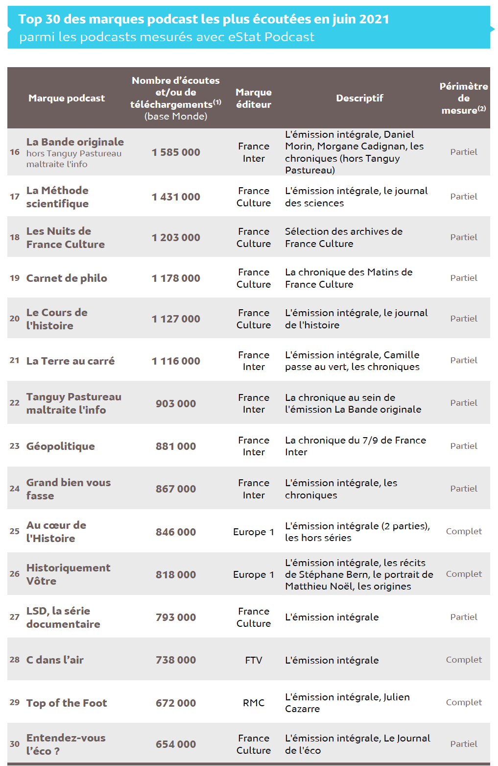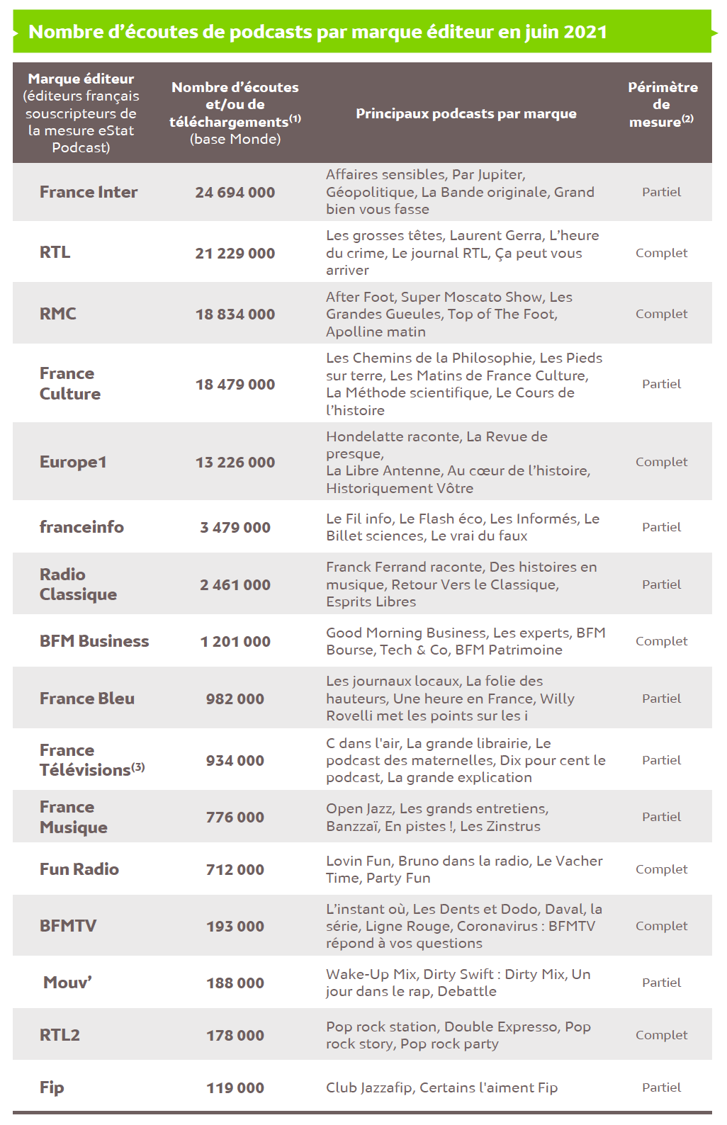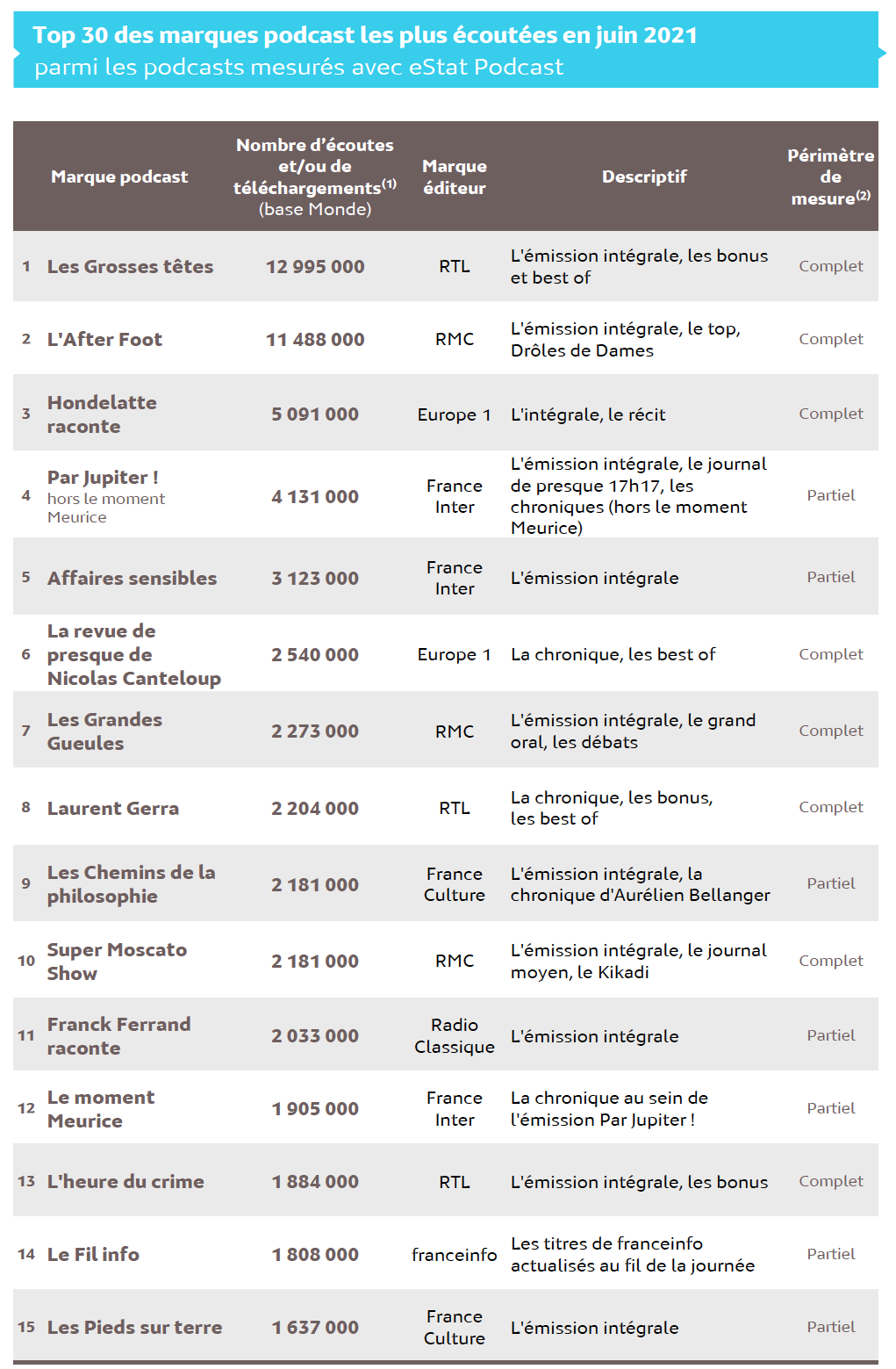 Dans ce nouveau classement eStat Podcast de Médiamétrie, France Inter tient toujours la première place dont les podcasts, et dans ce cas ici les replays, sont les plus écoutés. L'émission Les Grosses Tête génère, à elle seule, plus de 10% du volume total de l'audience avec plus de 12 millions d'écoutes et/ou de téléchargements...