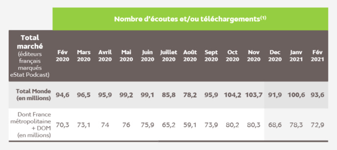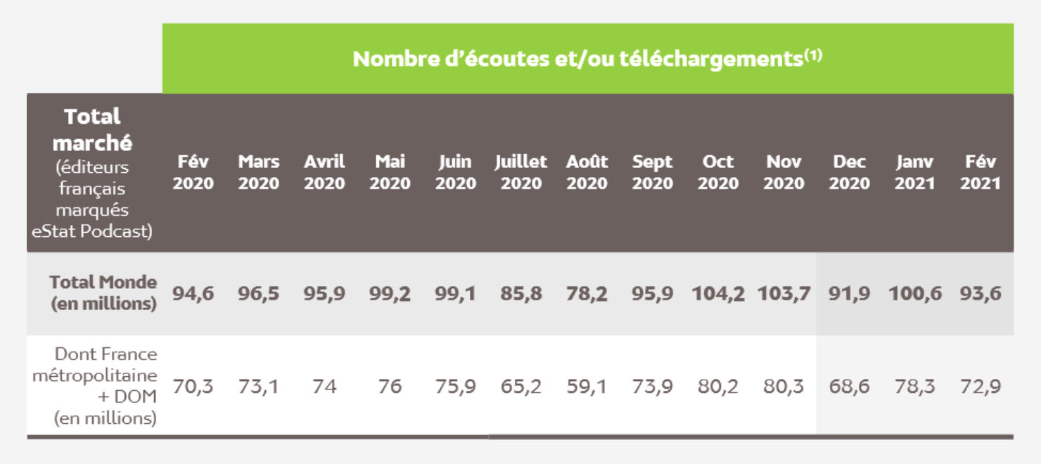 Au mois de février 2021, les Français ont écouté en streaming ou téléchargé 93.6 millions de podcasts à travers le monde. Une consommation mensuelle qui se maintient à un haut niveau depuis un an, dépassant chaque mois les 90 millions de contenus audio écoutés ou téléchargés (hors période estivale).