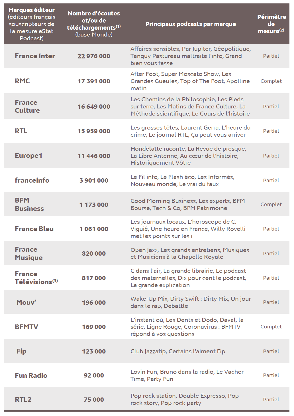 France Inter (avec près de 23 millions de podcasts), RMC, France Culture, RTL et Europe 1 forment le peloton de tête de ce classement mensuel.
