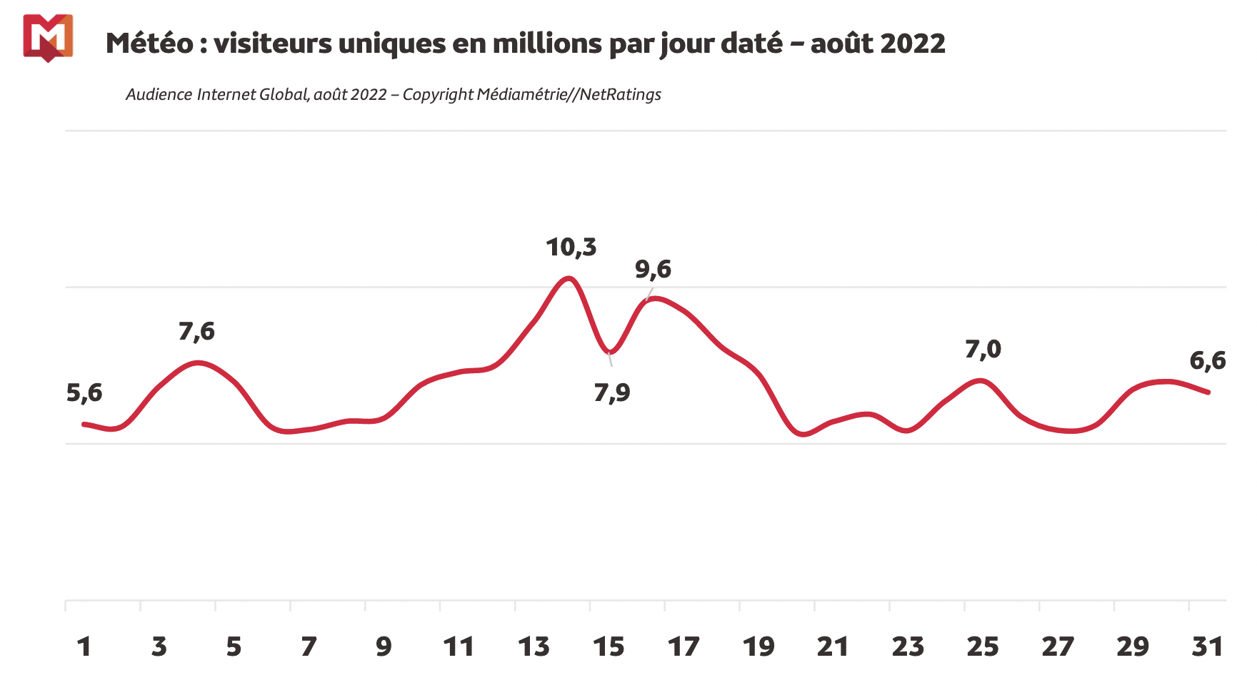 En revanche, moins d’un tiers (31%) des 15-24 ans s’y sont connectés (en baisse de 5 points par rapport à août 2021). Par ailleurs, chaque jour, plus d’un Français sur dix (11%) consulte la météo sur internet, soit 6.8 millions d’internautes. Cela représente 1.1 million d’internautes supplémentaires par rapport à août 2021.