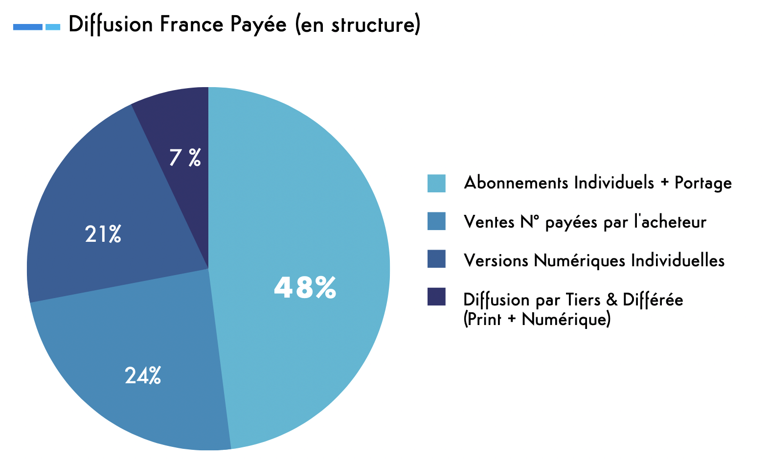 La diffusion individuelle représente 93 % de la Diffusion France Payée (DFP) et le premier canal de diffusion demeure l'abonnement (48% de la Diffusion France Payée). Sur un total de 25.1 milliards de visites sur les sites et applications, 20.9 milliards sont effectuées sur des supports mobiles (sites mobiles, sites AMP, applications).