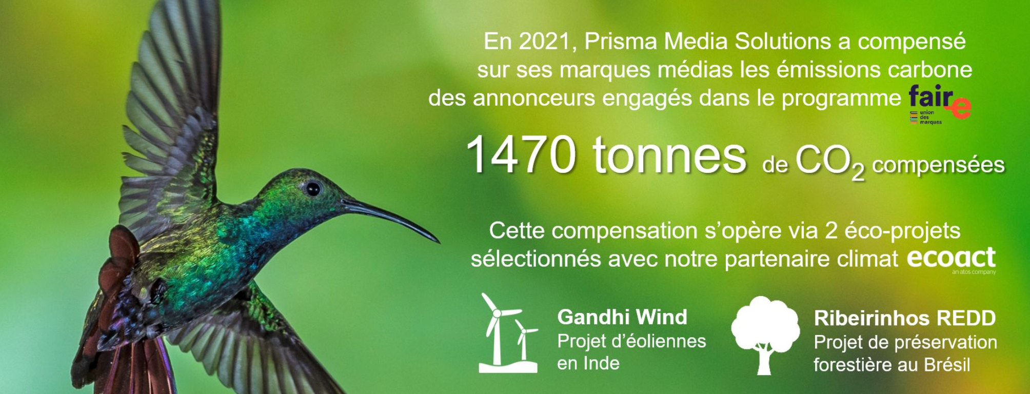 Le programme FAIRe de l’Union Des Marques, qui réunit plus de 40 grandes marques qui œuvrent pour une communication plus responsable, est apparu comme une évidence pour Prisma Media Solutions. Ainsi, l'entreprise s’est engagée à compenser l’intégralité des émissions carbone de ces annonceurs sur ses supports médias.