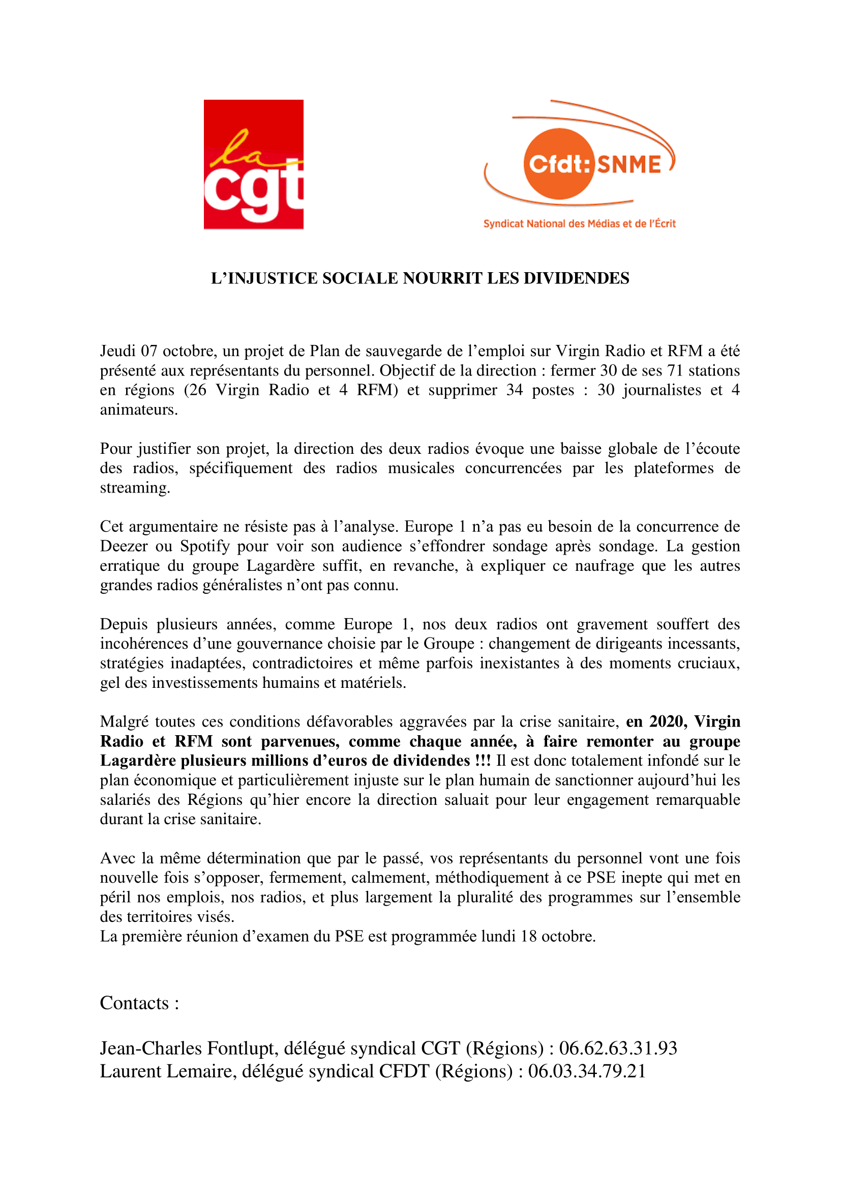 Selon ce même communiqué, "la direction des deux radios évoque une baisse globale de l'écoute des radios, spécifiquement des radios musicales concurrencées par les plateformes de streaming". Pour les syndicats, "depuis plusieurs années, comme Europe 1, nos deux radios ont gravement souffert des incohérences d'une gouvernance choisie par le Groupe : changements de dirigeants incessants, stratégies inadaptées, contradictoires et même parfois inexistantes à des moments cruciaux, gel des investissements humains et matériels". Les syndicats indiquent être fermement opposés à ce PSE "qui met en péril nos emplois, nos radios,, et plus largement la pluralité des programmes sur l'ensemble des territoires visés".
