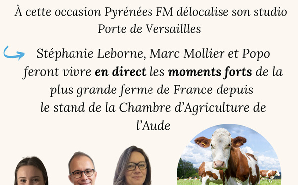 À l’occasion du Salon international de l’agriculture, Pyrénées FM délocalise ses studios Porte de Versailles au cœur de la plus grande ferme de France. Pendant une semaine, et depuis le stand de la Chambre d'agriculture de l’Aude, Stéphanie Leborne, Marc Mollier et Popo, feront vivre les moments forts de cet évènement incontournable aux auditeurs.