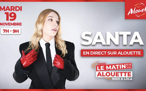 La chanteuse Santa sera l'invitée du Matin Alouette ce mardi 19 novembre de 7h à 9h. L’artiste, connue pour son tube "Popcorn salé" et son album "Recommence-moi", participera en direct à l’émission animée par Niko et Lola. Un moment exclusif ponctué d’échanges, de live musical et d’interaction avec les auditeurs.