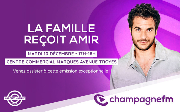 Champagne FM, la première radio locale de Champagne-Ardenne, donne rendez-vous à ses auditeurs pour un nouvel événement, le mardi 10 décembre. L’équipe de la radio accueillera le chanteur Amir pour une émission spéciale en direct du Centre Commercial Marques Avenue Troyes.