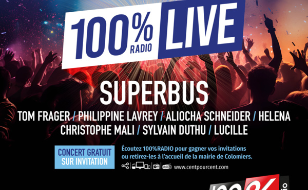 100%, la première radio indépendante d’Occitanie, organise ce vendredi 20 septembre son premier "100% Live" de la saison avec un plateau de 8 artistes Un concert de rentrée qui réunira Superbus, Héléna, Aliocha Schneider, Tom Frager, Christophe Mali, Philippine Lavrey, Sylvain Duthu et Lucille.