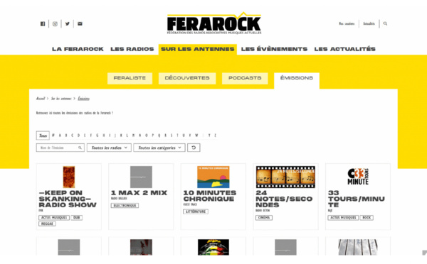 La Ferarock (Fédération des radios associatives des musiques actuelles) publie sur son site web une rubrique "Émissions" qui répertorie l’intégralité des émissions produites pas ses radios membres. Plus de 600 émissions différentes sont ainsi compilées sur sa nouvelle plateforme en ligne...