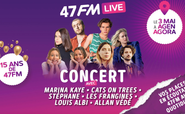 À cette occasion, 47 FM, la radio leader du Lot-et-Garonne, organise son premier concert privé le mercredi 3 mai à 20h30 à l'Agen Agora. Plus de 1 200 personnes sont attendues pour cet événement. Les places sont actuellement à gagner à l'antenne et par SMS. Les premiers artistes programmés sont Stéphane, Allan Védé, Cats on Trees, Louis Albi, Les Frangines, Marina Kaye...