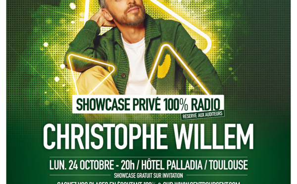 100% Radio, première radio indépendante d’Occitanie, invite Christophe Willem ce lundi 24 octobre 2022 dans l'amphithéâtre de l'hôtel 4 Étoiles Le Palladia, situé 271 Avenue de Grande-Bretagne à Toulouse. Le concert sera enregistré puis diffusé sur l'antenne, dès le lendemain.