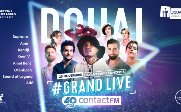 Contact FM et Douaisis Agglo organisent un nouveau Grand Live, le vendredi 25 novembre à Gayant Expo Concert. Pour célébrer ses 40 ans, la radio réunira sur scène Soprano, Amir, Kendji, Keen V, Amel Bent, Ofenbach, Soud of Legend et Adé...