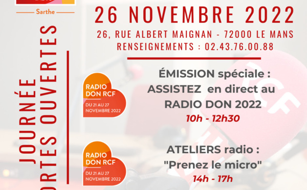 Dans le cadre du Radio Don organisé par RCF du 21 au 27 novembre, RCF Sarthe organisera une journée portes ouvertes dans ses locaux au Mans, le samedi 26 novembre. La station permettra aux visiteurs de découvrir ses studios situés au 26 rue Albert Maignan, de 10h à 17h.