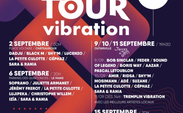 Pour cette nouvelle édition du Tour Vibration 2022, 9 nouveaux artistes confirmés dont Dadju à Châteauroux, Izïa et Soprano au Mans, Bob Sinclar, Mosimann, Adé et Suzane à Outarville et Amel Bent, La Zarra à Blois.