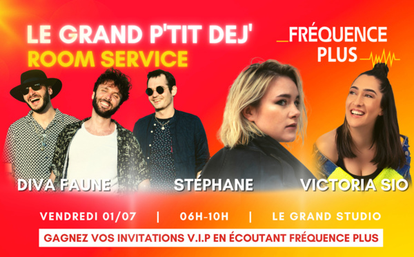 Cynthia et TotM, animateurs de la matinale "Room-Service" convient leurs auditeurs à une émission spéciale et en direct ce 1er juillet. De 6h à 10h, les auditeurs de Fréquence Plus pourront partager un "Grand p'tit dej' gourmand" avec Yogan, Valentin et Jérémy du groupe Diva Faune, la révélation francophone féminine de l'année Stéphane et la voix chantée du film "Aline", Victoria Sio.