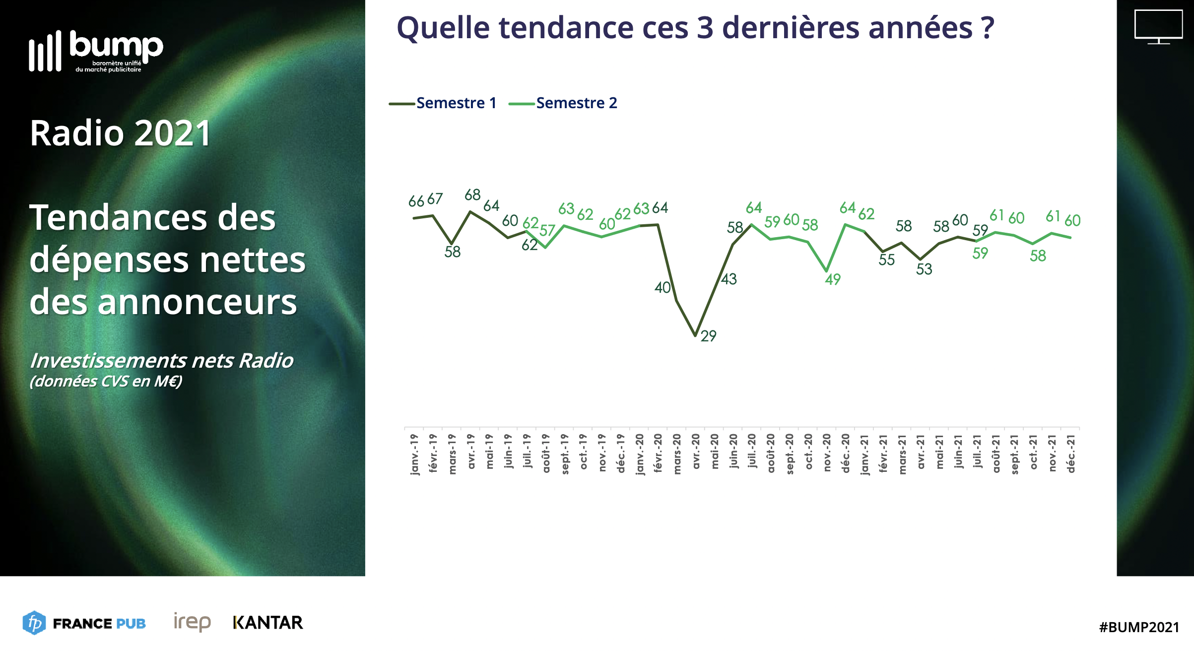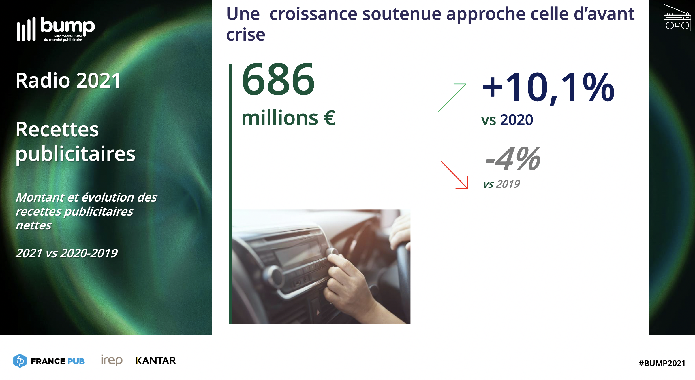 686 millions euros. C'est le montant des recettes publicitaires de la radio en 2021. Notre secteur enregistre une croissance soutenue de plus de 10 points comparativement à 2020 mais il enregistre une baisse de 4 points par rapport à 2019. Le seconde semestre de l'année 2020 a été très encourageant avec une hausse de près de 12% comparativement à l'année précédente. Le nombre d'annonceurs actifs s'est élevé à 2 764, en hausse de 11.6% versus 2020.
