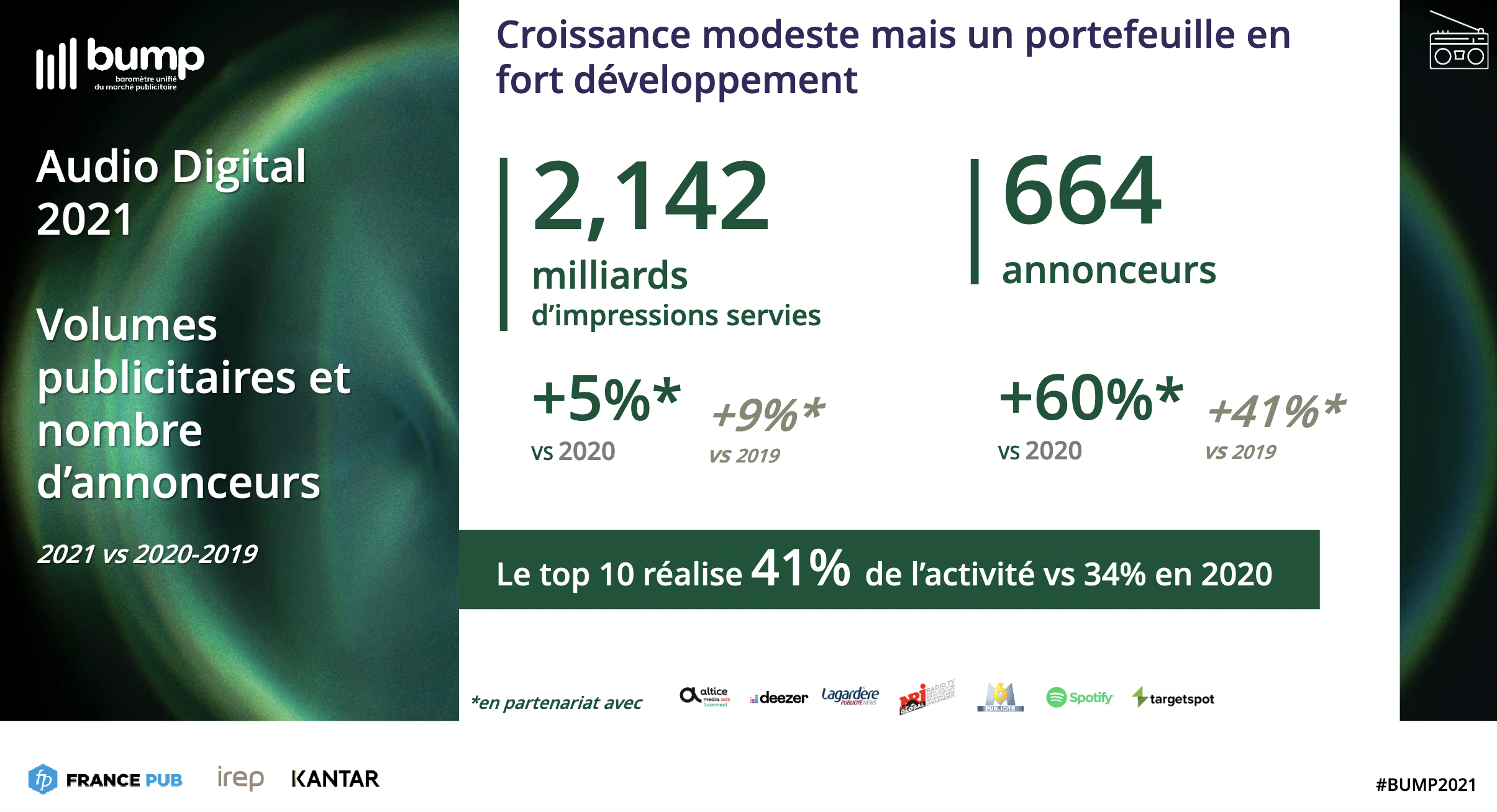 Par ailleurs, notons que le secteur de l'audio digital a enregistré une croissance modeste mais dispose d'un portefeuille en fort développement 2.142 milliards d’impressions servies et 664 annonceurs (en hausse de 60%).