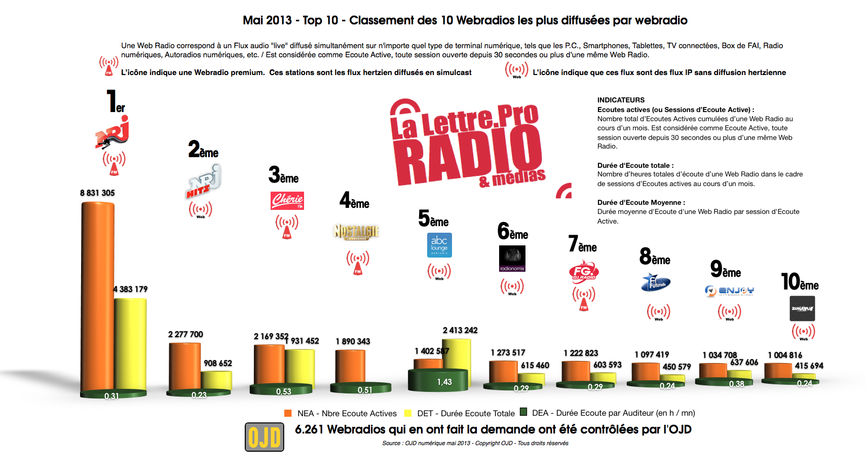 En mai dernier, 6 261 webradios ont été contrôlées par l'OJD, association pour le contrôle de la diffusion des médias et dont le rôle est de certifier la diffusion, la distribution et le dénombrement des journaux, périodiques et de tout autre support de publicité.