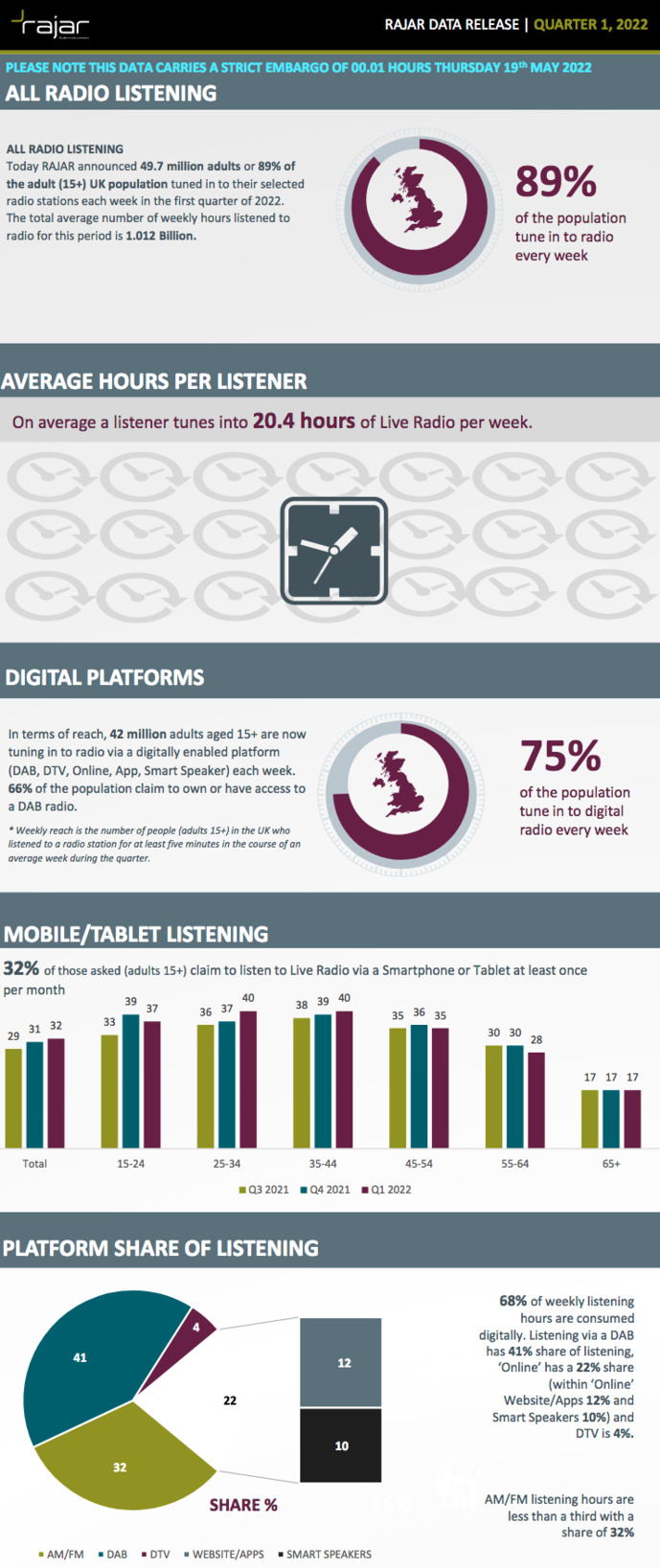 En moyenne, et sur cette période, un auditeur écoute 20.4 heures de radio en direct par semaine En termes de portée, chaque semaine, 42 millions d'adultes âgés de 15 ans et plus écoutent désormais la radio via une plateforme numérique (DAB, DTV, Online, App, enceinte connectée...) chaque semaine. 66% de la population déclare d'ailleurs posséder ou avoir accès à une radio DAB. Au total, 75% de la population écoutent la radio sur le numérique toutes les semaines.