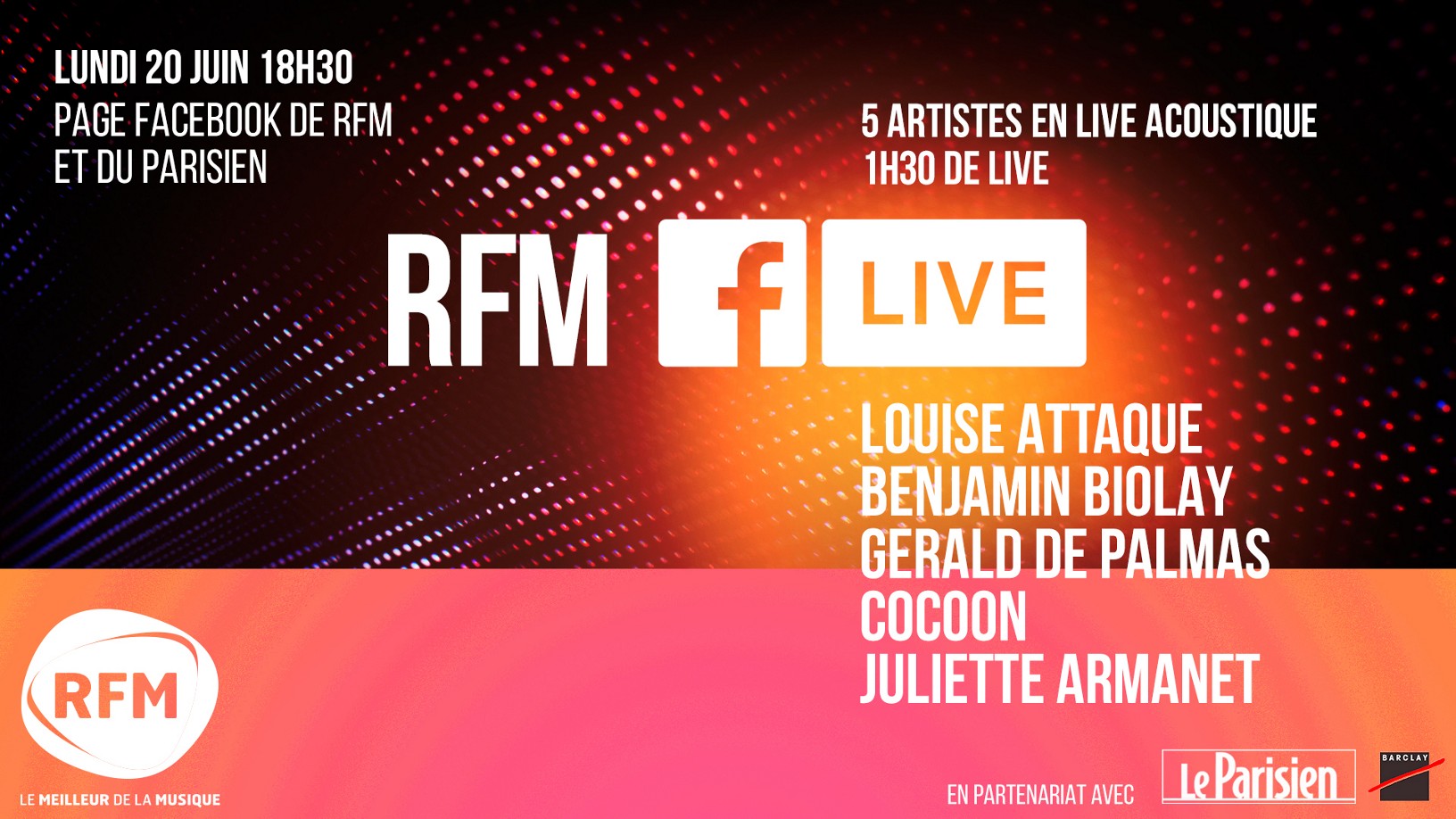 Après la première édition du RFM Facebook Live qui avait généré plus de 1 million de vues, RFM crée à nouveau l'événement, cette fois-ci à l'occasion de la Fête de la Musique. Pour suivre le live, il suffit de se connecter sur la page Facebook de RFM et du Parisien, qui est partenaire de cette soirée.