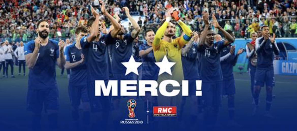 Depuis le coup de sifflet final, RMC fête la victoire et lance un marathon célébrant ce sacre historique. Jusqu’au bout de la nuit, un suivi permanent des envoyés spéciaux est assuré pour récolter les premières impressions et réactions des supporters en France et en Russie. Dès ce lundi, RMC suit pour les auditeurs le retour des Bleus avec ses envoyés spéciaux RMC Sport dépêchés dans toutes les villes de France qui se mobilisent pour témoigner des festivités dans tout le pays. Pendant toute la journée, les shows de RMC retracent avec de nombreux invités la performance de l’Équipe de France durant cette Coupe du monde, depuis son premier match de poule jusqu’à sa victoire en finale.